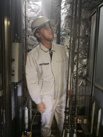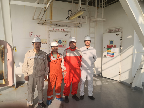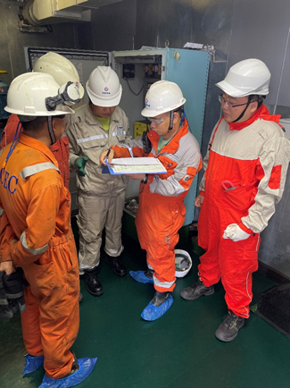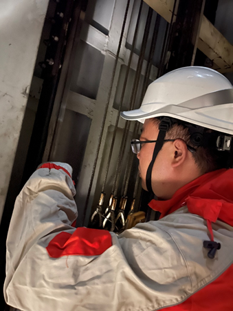 乘坐直升飛機(jī)順利抵達(dá)平臺(tái)后,檢驗(yàn)小組與公司安全管理部、電氣部、機(jī)修部開會(huì)研究,確定下一步電梯檢驗(yàn)方案及流程,技術(shù)交底及JSA(工作安全分析)。檢驗(yàn)時(shí)檢驗(yàn)人員嚴(yán)格按照國家標(biāo)準(zhǔn),逐項(xiàng)開展檢驗(yàn)檢測(cè)工作,分別對(duì)機(jī)房、轎廂、井道、底坑等方面進(jìn)行了安全部件檢測(cè)及功能性試驗(yàn),并對(duì)潛在的安全隱患進(jìn)行了識(shí)別與記錄。進(jìn)入防爆區(qū)域后,嚴(yán)格按照作業(yè)平臺(tái)安全指示執(zhí)行,佩戴警示器穿戴全套防護(hù)裝備,對(duì)防爆叉車的防爆部件、行駛性能及制動(dòng)性能等方面進(jìn)行了檢查。
