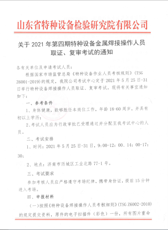 關于2021年第四期特種設備金屬焊接操作人員復審考試的通知